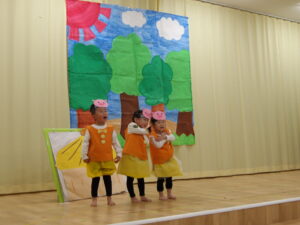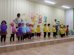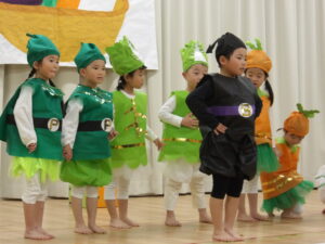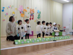 以上児になり劇に挑戦したクッキー組。大きな声でセリフを言ったり、歌を歌ったり、練習の成果を出し切りました。
